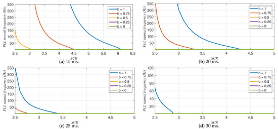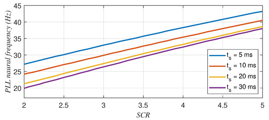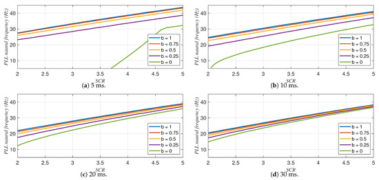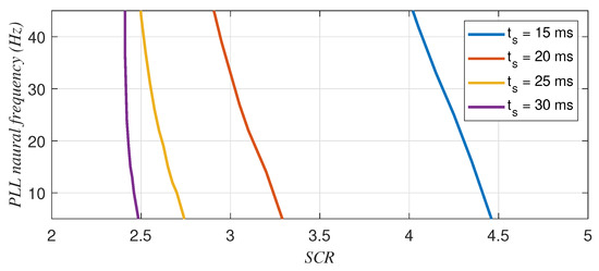 For the parameters of the current controllers presented in Table 4, Figure 12 shows the maximum PLL natural frequency as a function of the SCR for inverter mode. Similarly, Figure 13 shows the minimum PLL natural frequency as a function of the SCR for rectifier mode. Note that in Figure 12, the stable region is below the curves, whereas in Figure 13, the stable region is above the curves.