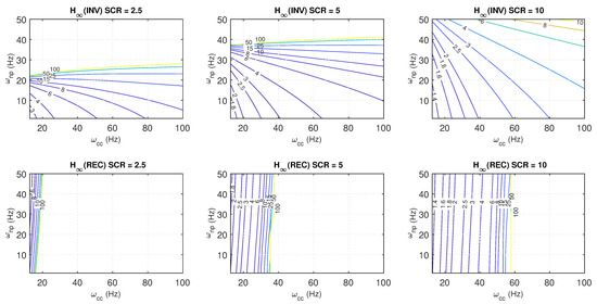 To clearly illustrate how the parameters of the current controller and PLL affect both robustness and performance, several contour plots (from Figure 16, Figure 17, Figure 18 and Figure 19) are presented below. Robustness refers to the -norm defined in (33), while performance is assessed through defined in (40). The PLL parameters have been taken into account by using the natural frequency (in Hz), represented on the vertical axes, and the current controller parameters by using (in Hz), represented on the horizontal axes. is defined as , where is the damping factor (for all simulations in this work, a damping factor of has been employed) and is the natural frequency (as can be derived from (4), in Hz is ) of the closed-loop current control loop (see Section 2). All contour plots have been obtained by performing a parameter sweep of and with a sufficiently fine step size for both inverter and rectifier operating modes. Specifically, Figure 16 and Figure 17 show the impact of varying SCR values while keeping the weighting factor b fixed at 1, and Figure 18 and Figure 19 maintain a constant SCR value and vary the weighting factor b, clearly demonstrating how the adjustment of b significantly enhances robustness and performance. Presenting the results in this manner provides a visual and intuitive understanding of how the different parameters affect robustness and performance, offering practical insights into controller design considerations.