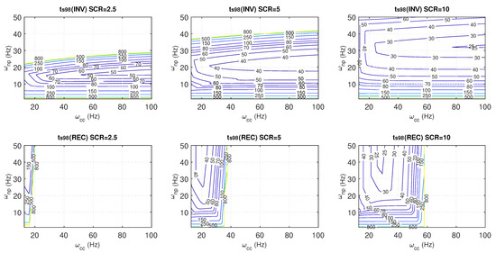 In weak grids, the achieved settling time may differ from that used to design the current controller due to variations in the PCC voltage during changes in active and reactive power, as well as potential oscillations in the current response if insufficient damping is provided. Figure 17 presents the achieved settling time at 98% (as defined in (40)) for the same conditions as in Figure 16, with the settling time derived from the dominant pole of the closed-loop system. It is observed that, for both operating modes, as the SCR decreases, the settling time increases and deviates further from the closed-loop time employed in the current controller design. In inverter mode, for a given current controller, an optimal PLL frequency exists that minimises the settling time, i.e., faster PLLs (or slower) lead to a slower system response. For instance, for SCR = 2.5, it can be observed that the PLL has a significant impact on the settling time. For a given , the fastest response is achieved with a PLL with a natural frequency around 15 Hz. If the PLL is faster or slower, the settling time of the current controller increases considerably. It is also observed that for a given PLL, faster controllers lead to smaller settling times; however, the speed of the response is much more influenced by the PLL design than the current controller parameters. Similarly, in rectifier mode, for a given PLL frequency, an optimal current controller minimises the achieved settling time and for a given controller, faster PLLs lead to smaller settling times and also improved robustness, with faster PLLs being favourable. However, in this case, the impact of the current controller is much more pronounced than that of the PLL.