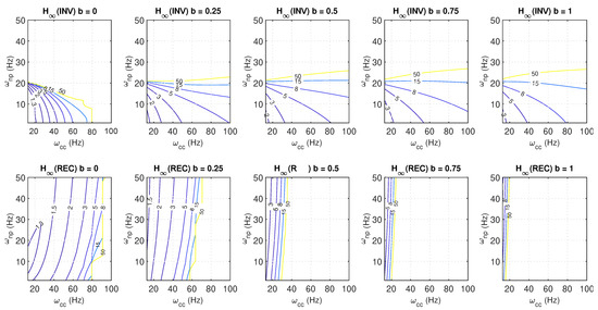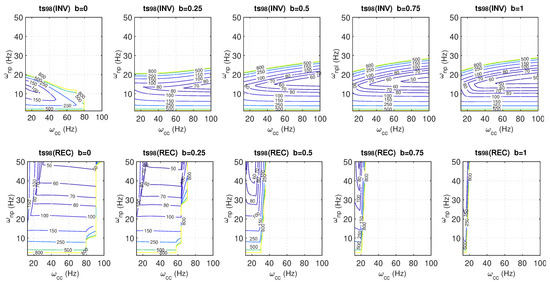 For an SCR of 2.5 and a sweep of different values of the weighting parameter b (0, 0.25, 0.5, 0.75, and 1), the contour plots for the -norm (Figure 18) and the settling times (Figure 19) are presented for both inverter and rectifier modes. In inverter mode, reducing b generally results in lower -norm values. However, the size of the feasible (stable) regions also decreases as b is reduced. As noted previously, in inverter mode, the PLL is the most critical component, so for a given current controller, the minimum PLL frequency that triggers instability decreases slightly with a reduction in b. In this sense, adjusting b mainly affects performance (e.g., the oscillatory behaviour) rather than stability. For rectifier mode, the parameter b yields considerably greater improvements in stability. As b decreases, the feasible region expands and improved robustness is observed through lower -norm values. Regarding the achieved settling times, in addition to the conclusions drawn from Figure 17, it is observed that as b decreases, the settling times increase, indicating a slower overall system response that diverges further from the design values.
