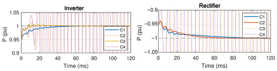 Figure 20 illustrates the time-domain responses in inverter and rectifier modes when the reference power changes from 0.95 pu to 1 pu (inverter) and from −0.95 pu to −1 pu (rectifier), considering an SCR of 2.5. The responses of four different controllers, as detailed in Table 5, are compared. Note that the same is used for all the controllers (25.5 Hz), which corresponds to a settling time of approximately 25 ms for the design of the current control loop. Therefore, in inverter mode, controllers with a slow PLL (C1 and C3) remain stable, with the weighting parameter b affecting only performance, as indicated by differences in oscillatory behaviour and settling times. In contrast, controllers with a fast PLL (C2 and C4) fall outside the feasible region, resulting in unstable system behaviour that cannot be corrected by adjusting b. For rectifier mode, controllers with a lower b value (C1 and C2) lead to a stable system response, with the PLL primarily influencing performance (with faster PLLs being more favourable). Controllers with (C3 and C4) fall outside the feasible region, leading to instability.