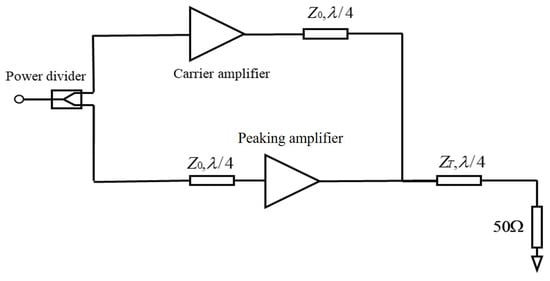 The classical Doherty PA is symmetric and consists of a 3 dB filtering power divider with an equal output power ratio, two power amplification transistors, and a load modulation network, shown as in Figure 1. The identical transistors are used in both branches of the PA. One works in class AB to amplify the carrier signal as the main amplifier, and another works in class C to boost the peaking signal as an auxiliary amplifier [15,16]. The key to the Doherty PA is the active load-pull technique, which means adjusting the load impedance by supplying a specific current to an active device from another active device. Therefore, the load impedance changes with these two active devices rather than being fixed [17]. This technique makes the carrier amplifier achieve saturation fast and stay in a high-efficiency working condition, which is the key to maintaining the Doherty PA consistent and efficient in the whole back-off area [18].