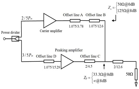 Considering the influence of the bias circuit, the matching circuit, and the power divider, it is also necessary to utilize offset techniques to improve the circuit performance, as shown in Figure 2. The offset line A, located at the carrier amplifier terminal, matches the phase of the terminal impedance to the load impedance, increasing the back-off efficiency [30]. The offset line B is a quarter wavelength microstrip line to realize the impedance transformation. The offset line C, located at the peaking amplifier terminal, is adjusted to an appropriate length. When the peaking amplifier has not yet been opened, the offset line C can pull up the terminal impedance and suppress the power leakage of the carrier amplifier [31]. The offset line D corrects the phase difference introduced by impedance transformation networks and the other offset lines mentioned previously to maximize the output power at the summing node [32,33].