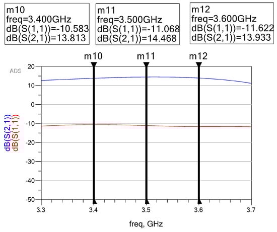 Based on the schematic of PA, the design performs S-parameter simulation. As shown in Figure 3, the measured S11 and S21 at 3.5 GHz are −11.068 dB and 14.468 dB, respectively.