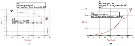 Based on the schematic of PA, the design performs large-signal simulations over the pre-designed band. Figure 4a shows that the small-signal gain at 3.5 GHz is 14.43 dB when the output power is 14.63 dBm, and the gain is 10.14 dB when the output power is 47.11 dBm. In Figure 4b, the drain efficiency is 74.895%, where the saturation output power of 47.86 dBm is delivered. At the 8 dB back-off point, i.e., the output power equals 39.93 dBm, the drain efficiency is still 51.29%.