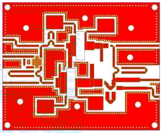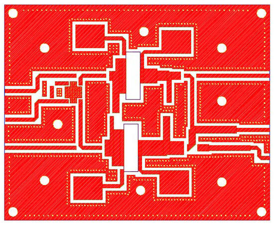 Following the schematic diagram simulation, this paper needs to thoroughly consider package sizes of transistors, isolated capacitors, and other components to operate the layout. According to the traditional layout design method, transistors and the power divider chip are located based on packages of CGHV40030F and CMX35Q05. The grounding holes are evenly distributed around the microstrip line and in the margins of PCB to isolate signals and dissipate heat [34]. The fixing holes for installing the heat dissipation board are distributed in the blank as evenly as possible to keep the heat dissipation board attached to the PCB hardly. To facilitate the subsequent tests, four flying wires are reserved and installed at the input ports and output ports of the main and auxiliary amplifiers, respectively. The layout of the PA circuit is shown in Figure 6.