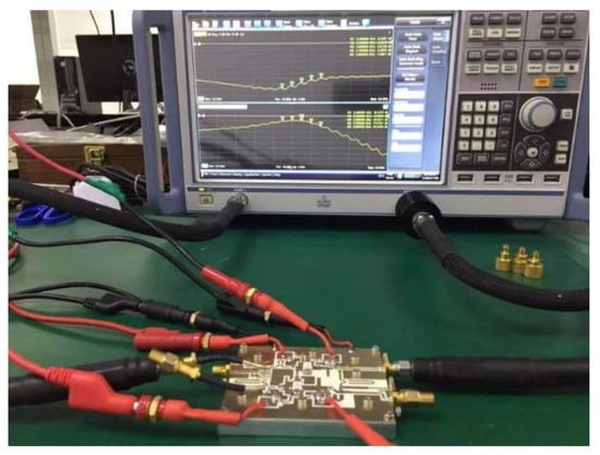 In the design of the asymmetric Doherty power amplifier, an independent multi-step debugging strategy is used to optimize the main and auxiliary amplifiers individually and in combination, result in a significant enhancement of design efficiency and performance reliability. The first step is debugging the main amplifier. By adjusting the input matching circuit to optimize the parameters of standing wave, the main amplifier operates in class AB. By tuning the output matching network, the efficiency and the output power are boosted. The targets are a saturated efficiency of over 60% and an output power error of less than 0.5 dB. The second step is to perform high-impedance debugging for the main amplifier. By disconnecting the auxiliary amplifier, the test from the main amplifier’s input to the end of the microstrip line after the combiner is performed to verify the load-modulation effect. The increase of the saturated efficiency should be 2%, and the drop of output power should be no more than 2 dB. Adjusting the compensation line length is used to prioritize efficiency in the design. The third step is debugging the auxiliary amplifier independently. Given the differences in the asymmetric structure, the auxiliary amplifier’s matching circuit is optimized individually to meet the stand-wave parameters and efficiency requirements in class AB. The fourth step is to debug with the connection of auxiliary amplifier. By connecting the auxiliary amplifier’s output to the combiner point and inserting a 50 terminator to the input, the cut-off state is simulated. The verify that the main amplifier’s performance is not disturbed ensures that there is no hidden load disturbance in the auxiliary amplifier circuit. The fifth step is debugging the entire combined circuit. The main and auxiliary amplifiers are connected fully and the lengths of input compensation lines are calibrated to eliminate phase offset. Fine-tuning the output matching network and gate bias is to enhance both efficiency and linearity performance. As shown in Figure 8, the main amplifier is being debugged.