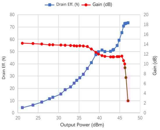 At 3.5 GHz of interest, S-parameter simulations are performed, S11 is −10.73 dB and S21 is 13.83 dB. The large-signal test curves of the PA after debugging and optimizing are shown in Figure 11, which presents the drain efficiency and the gain versus the output power, respectively, in the optimal working state. When the input power ratio of the main amplifier to the auxiliary amplifier is 1:1.5, the saturation output power is 47.02 dBm, and the saturation drain efficiency is 73.5%, the gain of 9.88 dB, and the PAE is 63.74%. At the 8 dB back-off point, i.e., the output power equals 39 dBm, the drain efficiency is 47.5%. These results meet the design specifications of the PA for 5G applications.