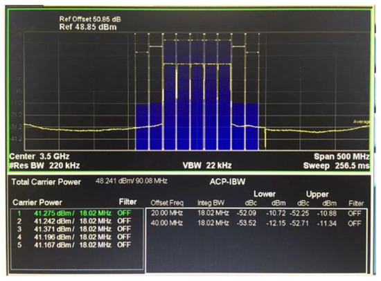 To meet the stringent linearity requirements of wireless communication systems, the designed PA is calibrated using DPD module. As shown in Figure 12, following DPD calibration, the measured power levels at 20 MHz offsets from the lower and upper band edges of the designed frequency range are −52.09 dB and −52.25 dB, respectively. The adjacent channel power ratio (ACPR) meets the engineering design specifications, confirming compliance with linearity performance targets.