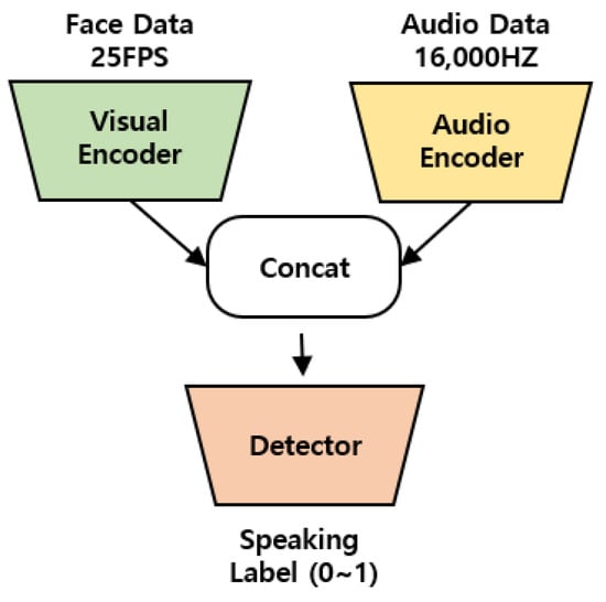 One approach to avoid retraining and minimize device dependency is to leverage deep learning models that are pre-trained on large-scale datasets. For instance, the AVA-Speaker Detection dataset—constructed from various Hollywood movies—includes videos captured at diverse camera resolutions and audio recordings from different environments [9]. Many audio–visual models trained on this dataset have demonstrated strong performance [10,11,12,13]. These methods leverage the multi-modal data from video by encoding visual features from sequences of facial images alongside audio signals. The fused features are then used to determine whether an individual is speaking within a given frame. Typically, such methods employ multi-stage frameworks to enhance detection performance. However, this dataset does not fully represent the range of noise encountered in real-world scenarios; consequently, models trained on the AVA-Speaker Detection dataset tend to experience degraded performance under actual noisy conditions [14].