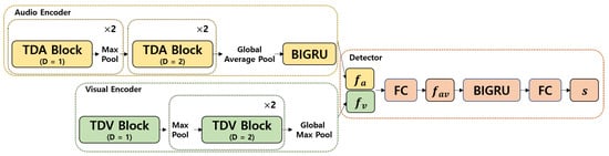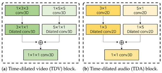 Figure 2 shows the Time-Dilated Video (TDV) and Time-Dilated Audio (TDA) block structures. In traditional speaker detection models, 3D convolution has been used to construct a visual feature encoder [37,38]. This approach also extracts temporal features by utilizing continuous images of the user’s face. However, 3D convolution increases the parameters and computational load of the model. To address this issue, various studies have demonstrated the effectiveness of decomposing operations into 2D and 1D convolutions, thereby reducing the computational burden associated with 3D convolutions [39,40]. This dimension-splitting approach has proven effective in extracting both spatial and temporal features, facilitating the development of Light ASD [12].