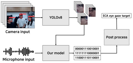 Based on the proposed speaker detection model, we implemented a gaze control system for ECAs engaged in multi-party conversations. The overall architecture is shown in Figure 4. We used the PyTorch framework with Python 3.9, and all of the experiments reported in this paper were conducted on a Windows 11 PC equipped with an NVIDIA GeForce RTX 4090 GPU. Images were captured at 25 fps using an Intel RealSense D455 camera, and the audio was recorded with a USB mono microphone. Both audio and video were preprocessed before being fed into the speaker detection model.