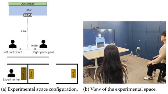 Figure 6 illustrates the experimental setup. The experiment was conducted in an open, uncontrolled office space. As shown in Figure 6a, a desk was placed in front of a 65-inch TV to create the illusion that the desk was in a virtual environment that seamlessly extended from the real desk. This arrangement was designed to provide an immersive experience for the user, merging the real and virtual spaces. The virtual space featuring the ECAs was developed using the Unity game engine (https://unity.com/, accessed on 5 February 2025). Since the experiment was conducted in an office setting, the ECA appeared within a virtual background that simulated an office environment. Two participants were positioned at a distance where their gaze could be recognized on the 2D display, allowing for precise monitoring of their gaze [8]. Participants were also seated in a way that prevented them from seeing the experimenter controlling the ECAs.