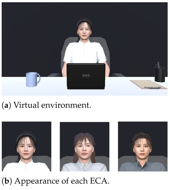 Figure 7a shows the virtual environment used in the experiment. Each ECA had unique hairstyles, clothing, and skin tones, as illustrated in Figure 7b. The three ECAs were modeled to resemble ordinary women, each based on photos of different individuals and were uniquely crafted using Character Creator 3 (https://www.reallusion.com/character-creator/, accessed on 5 February 2025). Distinct voices for each ECA were generated using the Naver Cloud Platform’s CLOVA Voice API (https://developers.naver.com/products/clova/tts/, accessed on 5 February 2025), giving each character a unique voice. Lip movements for dialogue were synchronized using the SALSA LipSync Suite (https://crazyminnowstudio.com/unity-3d/lip-sync-salsa/, accessed on 5 February 2025), while gaze and body coordination were managed by Final IK (http://root-motion.com/, accessed on 5 February 2025), enabling the ECAs to engage in natural conversation and establish eye contact with the participants.