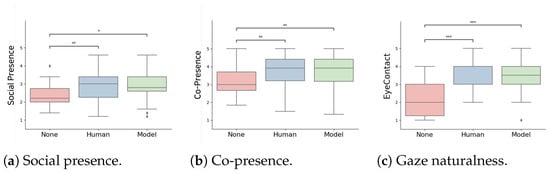 - Gaze Naturalness: There were significant differences between the None and Human (p < 0.001), as well as between the None and System (p < 0.001), conditions. There was no significant difference between the Human and System conditions (see Figure 8c).