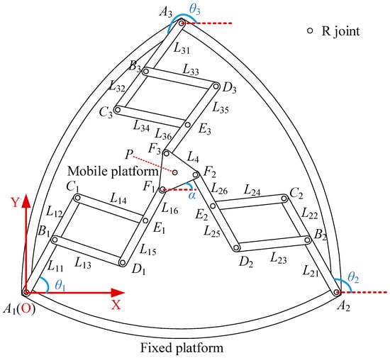 The degrees of freedom of this parallel mechanism is 3 on the basis of Equation (1). The mobile platform can achieve two translations (2T) along X/Y axes and one rotation (1R) about the Z direction. The point P represents the geometric center of the mobile platform F1F2F3, and its location is (xP, yP). The rotational motion is defined by the angle α between the linkage F1F2 and the positive X direction. Three actuators mounted for the revolute joints at points A1, A2, and A3 are sufficient for its movement. The i-th actuator’s angular position is defined as θi, and the reference is the positive X-axis. All angles are measured in a counter-clockwise direction.