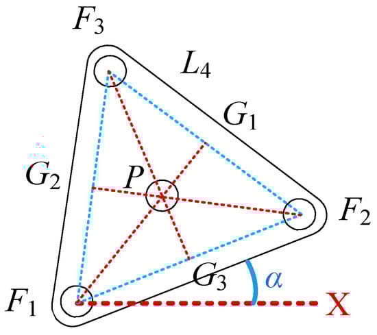 It is necessary to relate three vertices’ coordinates and the center point location of the mobile platform considering its geometric shape. The mobile platform is indicated in Figure 2. Three medians, F1G1, F2G2, and F3G3, are perpendicular medians. The center point P is the common intersection of these three medians. According to Figure 2, the following vector-loop equations can be obtained,