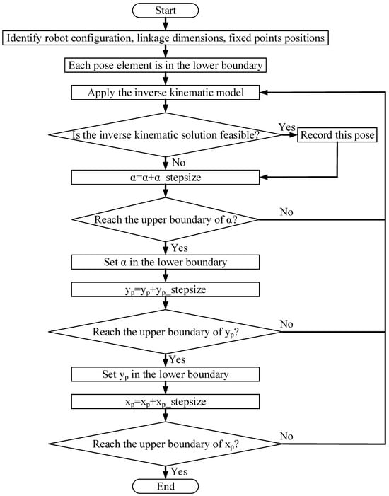 The reachable workspace of this planar parallel manipulator is defined as all possible poses the mobile platform center point P can reach. The widely used discrete spatial searching algorithm [,] indicated in Figure 3 is utilized to explore its reachable workspace. The overall procedure is summarized as