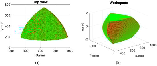 The angular position ranges of three actuation joints are predefined with the consideration of singularity configurations avoidance mentioned in Section 3. The range is for the first and second actuation joints. The third driving joint ranges from to .
