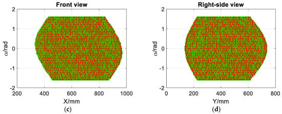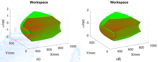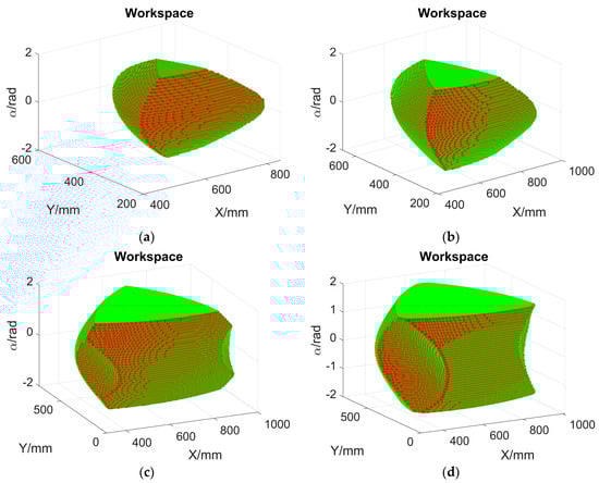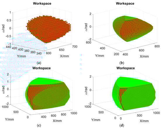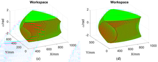 According to Table 1 and Figure 4, Figure 5, Figure 6, Figure 7, Figure 8 and Figure 9, the reachable workspace shapes are similar to Figure 4b. In each group of plots from Figure 4, Figure 5, Figure 6, Figure 7, Figure 8 and Figure 9, the last two reachable workspace plots (the chosen linkage dimension is longer than that in predefined dimensions) are truncated in three side directions, but the workspace ranges along both the X and Y directions are larger than that of the predefined dimensions. The corresponding workspace volume ratios are higher than 100%, while the ratios of the first two scenarios (the chosen linkage dimension is shorter than that in predefined dimensions) are smaller than 100%. The longer the selected linkage in the single variable comparison, the larger the workspace, as observed from four subplots in each figure. Among all these scenarios, the scenario where Li3 = 100 mm has the smallest orientational range [−0.79, 0.79], while the orientational range of the other scenarios are the same. The workspace in Figure 6a is the smallest since it has 4334 feasible poses, and the workspace volume ratio is 1.05%. The workspace in Figure 6d is the largest because it owns 1,295,064 qualified poses, and the workspace volume ratio is 312.63%.