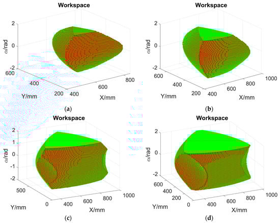 Impacts of Li6 on the reachable workspace layout. (a) Li6 = 50 mm; (b) Li6 = 100 mm; (c) Li6 = 200 mm; and (d) Li6 = 250 mm.