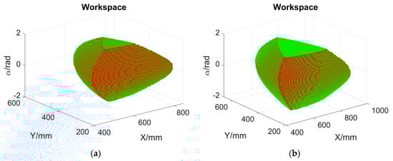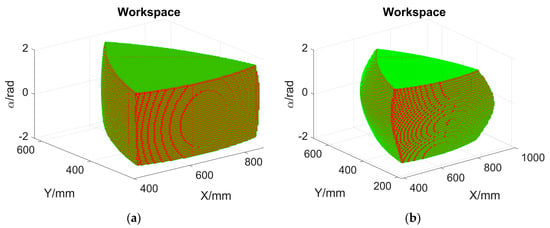The large reachable workspace of this parallel robot originates from its simple structure and the applications of pure revolute joints. According to Table 1 and Figure 4, Figure 5, Figure 6, Figure 7, Figure 8 and Figure 9, it is possible to improve the reachable workspace volume by changing linkage dimensions appropriately. It is also worth noticing that the local condition index is not close to the best value 1. A systematic dimensional synthesis can be employed to maximize this robot’s various performance indices once an application is determined, along with its detailed design requirements [,,]. It is noteworthy that the workspace accuracy can be improved with much smaller step sizes (, , and ), while the computation cost will grow significantly. The workspace comparison should be implemented under the identical step size settings.