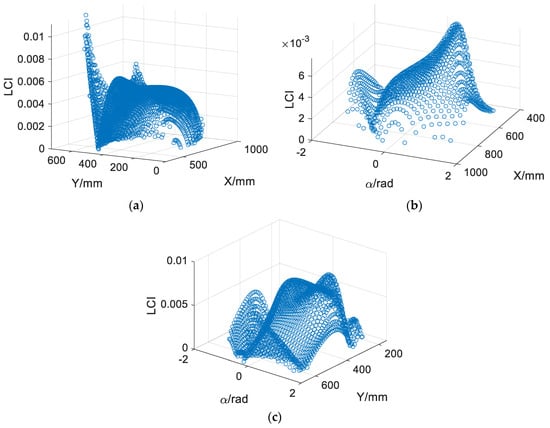The distributions of the local condition index within the reachable workspace are demonstrated in Figure 10. One element in the mobile platform pose is set as a constant number in each subplot for the purpose of illustration. = 0 in Figure 10a, yP is set as 400 mm in Figure 10b, and xP is 700 mm in Figure 10c.