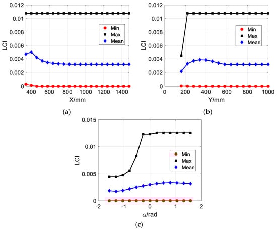 Layout of the local condition index. (a) = 0; (b) yP = 400 mm; and (c) xP = 700 mm.