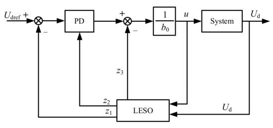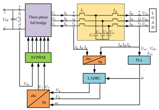 The core advantages of Linear Active Disturbance Rejection Control (LADRC) lie in its strong disturbance rejection capability and model adaptability. By utilizing a Linear Extended State Observer (LESO), it can estimate and compensate for both internal and external system disturbances in real-time. This significantly reduces the dependence on precise mathematical models. Additionally, its simple linear structure facilitates engineering implementation. Compared to traditional PID control, this method improves dynamic response speed and robustness, making it particularly suitable for high-frequency, high-interference operating conditions in GaN inverters. Moreover, the parameter tuning of LADRC is intuitive, effectively balancing disturbance rejection performance and stability. It compensates for the shortcomings of traditional control methods in suppressing broadband interference. So, the system employs a linear active disturbance rejection control (LADRC) strategy, and a control block diagram is depicted in