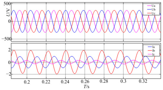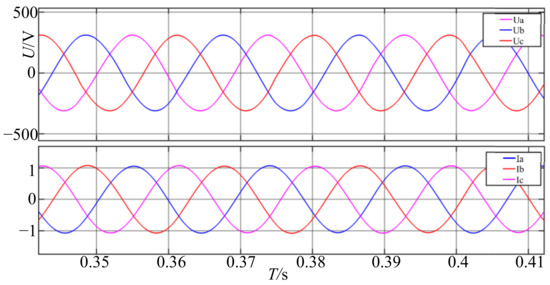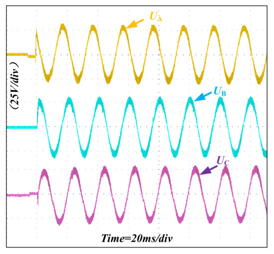 The three-phase unbalanced load access system is used for testing, and the output voltage and current waveforms are shown in