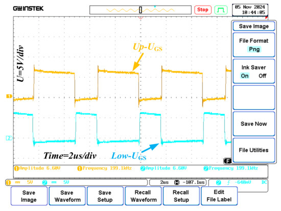 UGS is measured by the oscilloscope probe. The source voltage UGS waveforms of the upper tube and lower tube gate in phase A are shown in