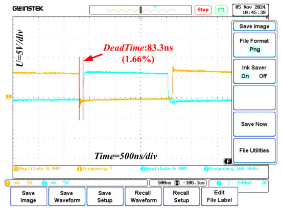 UGS = 6.6 V, thus meeting the driving requirements of the GaN power devices used. The upper and lower tube drive dead zone time is set as shown in