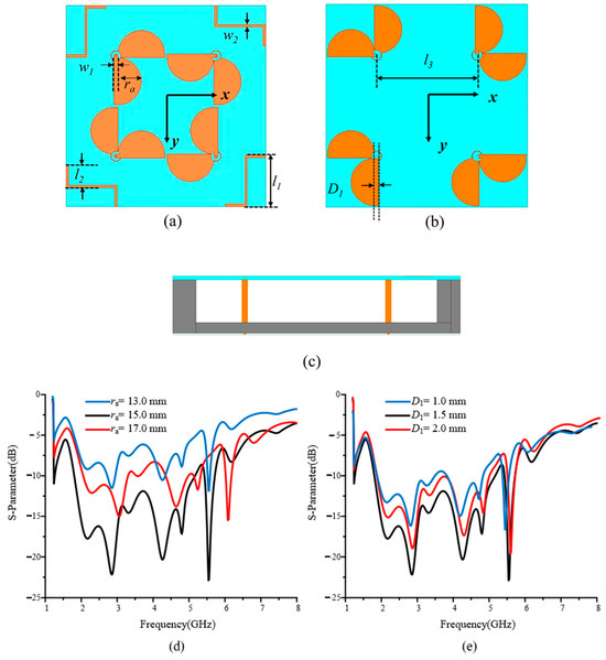 Schematic diagram of the broadband cross-dipole radiator model: (a) top view; (b) bottom view; (c) main view. ra = 15.51 mm, w1 = 2.69 mm, l1 = 34.07 mm, l2 = 14.70 mm, l3 = 70 mm, D1 = 1.2 mm. Simulated S-parameters of elements with different (d) ra and (e) D1.