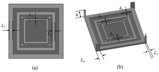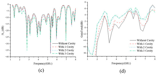Based on the broadband cross-dipole rotating array with Z-shaped parasitic radiating units of Section 2.1.1, we further propose the use of an annular stepped metal reflective back cavity as the reflective floor structure of the antenna, as shown in Figure 2a,b, which is a schematic of a metal reflective back cavity with a length and width of 140 mm × 140 mm. The performance of the antenna can be improved by using a back-cavity reflector as an additional radiator. The main principle is that when the main radiator is excited, the coupling aperture is formed by the edges of the cavity. The reflection phase varies more at different frequencies for stepped ground than for flat ground. Varying the scan angle also has a significant effect on the phase of the reflection. The impedance bandwidth of the antenna can be increased by using a stepped ground without increasing the profile of the antenna. To verify the feasibility of the ring step metal reflective back cavity, the S-parameter and gain of the antenna with the different layers of the ring cavity are presented in Figure 2c,d. It can be clearly observed that when the number of ring cavities increases, the impedance matching of the antenna continues to slightly improve and the gain continues to increase.