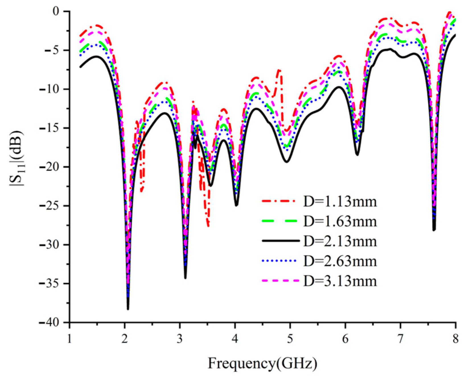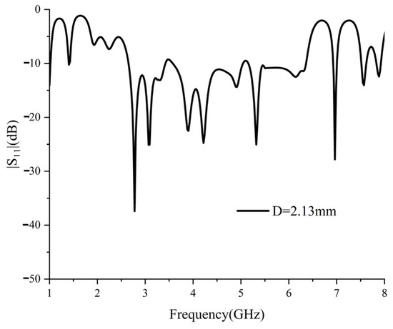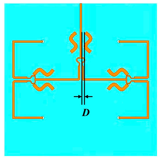 The structural design is further parametrically simulated using commercial full-wave simulation software HFSS. The bottom feed network consists of two levels of cascaded Wilkinson power dividers, consisting of three isolation resistors of 100 Ω resistance. The isolation resistors maximise the elimination of reflections and interference within the power splitter, ensuring the best possible match between input and output. In addition, six S-shaped parasitic radiation patches have been added around the main feed network to increase design freedom and further improve impedance-matching performance. On this basis, the S-parameter performance of the antenna under different coupling performances is obtained by adjusting the distance between the S-shaped parasitic patches on both sides of the bottom main feed network and the main feed network, which is shown in Figure 3, where the red material is the metal copper foil, the purple one is the isolation resistor, and the azure one is the dielectric substrate. The simulated reflection coefficients of the proposed power divider with different D are shown in Figure 4. The optimum spacing between the parasitic radiation patch and the main feed network, derived from Figure 4, is 2.13 mm. With this spacing, the power divider can achieve optimised impedance matching over a wide range of frequencies. Figure 5 shows the S-parameters of the entire antenna array with this spacing.