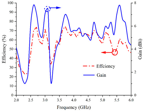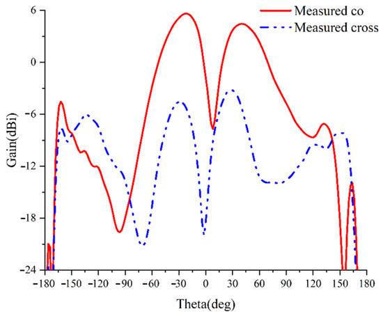 The 3D radiation pattern of the antenna is shown in Figure 9. The radiation null can clearly be observed in the broadside direction, proving the achievement of the OAM beams within the impedance-matching bandwidth of the proposed antenna. The variation in the measured maximum gain and radiation efficiency with frequency is shown in Figure 10. From Figure 10, it can be seen that the maximum radiation efficiency of the antenna can be up to 74.7% and the maximum gain can be up to 7.81 dBi, which explains the performance of the antenna to some extent. Figure 11 shows the far-field orientation of this antenna at 3 GHz. The beam is cut in the xoz plane (phi = 0°), and the corresponding coordinate system is marked in Figure 1. Due to the 90° rotational symmetry of the antenna structure, only one cross-sectional result is presented in this paper, as the result of the orthogonal cross-section is nearly identical. It can be observed that the left-hand circular polarisation main component at 3 GHz is 12 dB higher than the cross-component, which presents a vortex characteristic.