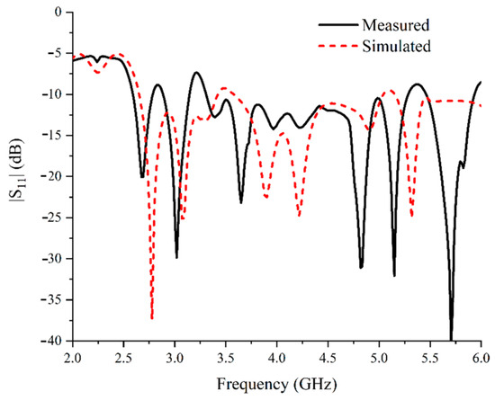 Then, the S-parameters of the antenna are measured using an Agilent vector network analyser (E8363B). The vector network analyser is manufactured in Agilent Technologies, originating from the USA. The measured results are shown in Figure 12. When comparing test results with the S-parameters obtained from simulation, the simulation results indicate that the frequency ranges of the antenna with |S11| lower than −10 dB are 2.65 GHz~3.42 GHz and 3.58 GHz~5.03 GHz, while the measured results show that the antenna with |S11| lower than −10 dB are 2.58 GHz~2.77 GHz, 2.88 GHz~3.14 GHz, and 3.31 GHz~5.28 GHz. The relative bandwidth is 61.58%. This shows that the employed ring step metal reflective back cavity as well as parasitic radiation patches are effective. The discrepancy between the simulated and measured refection coefficient is introduced by the four coaxial cables which are used to connect the dipoles and the feeding network. During the fabrication procedure, it is difficult to achieve coaxial cables with four segments of exactly equal length, due to manual manufacturing errors. The different lengths of the coaxial cables will generate reflection fields with different phase delays, thus resulting in the slight offset in the reflection coefficients.