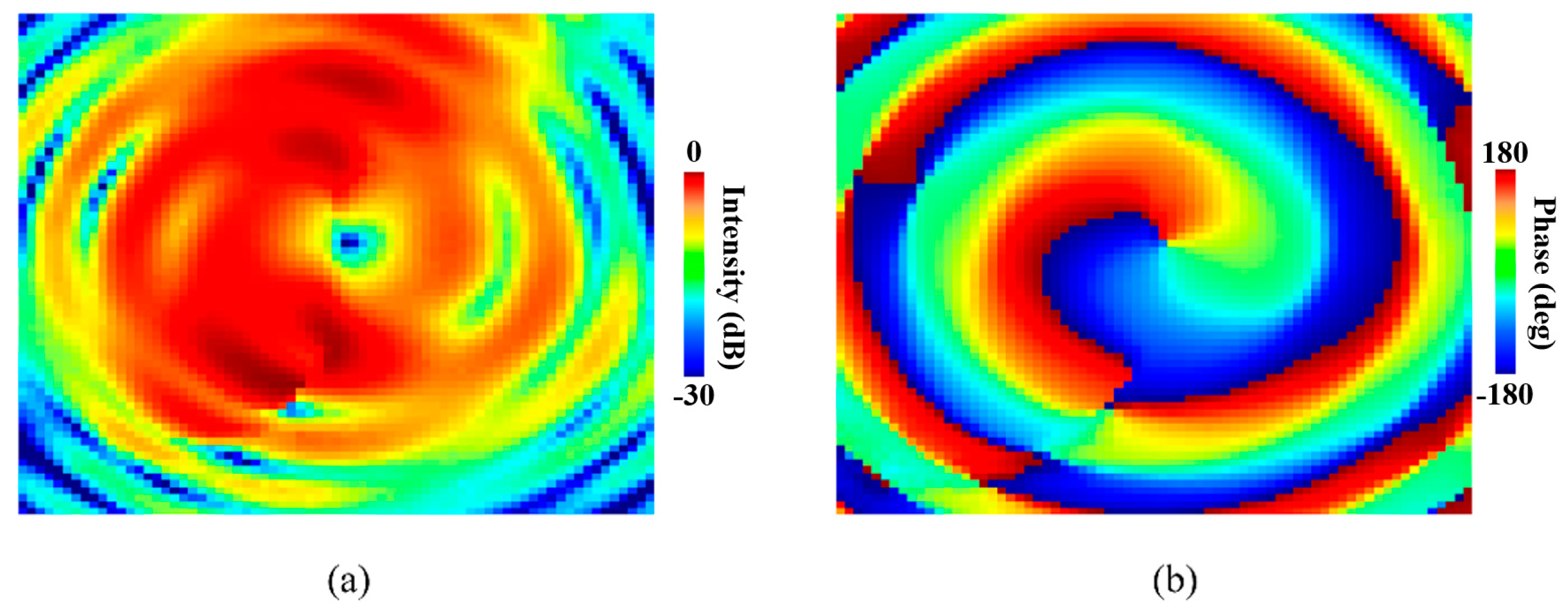 - Yuan, T.; Cheng, Y.; Wang, H.; Qin, Y. Mode characteristics of vortical radio wave generated by circular phased array: Theoretical and experimental results. IEEE Trans. Antennas Propag. 2017, 65, 688–695. [Google Scholar]