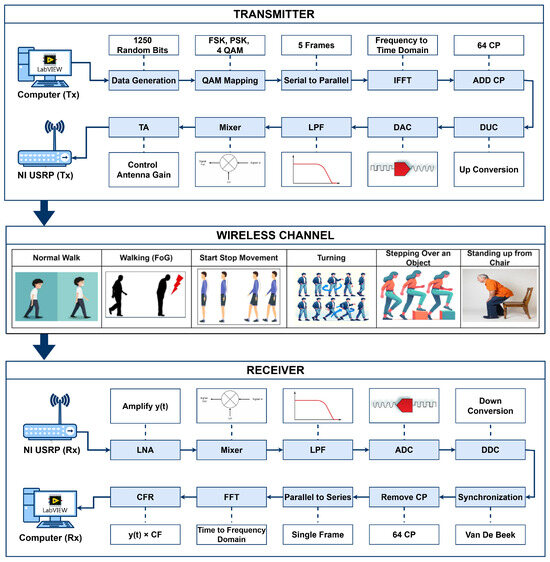 The real-time implementation of the intelligent FG detection system is presented in Figure 2. The identification of PD symptoms, such as FG, through the analysis of gait patterns using RF sensing and SDR technology involves several intricate phases: dataset collection, data pre-processing, data classification, and performance evaluation.