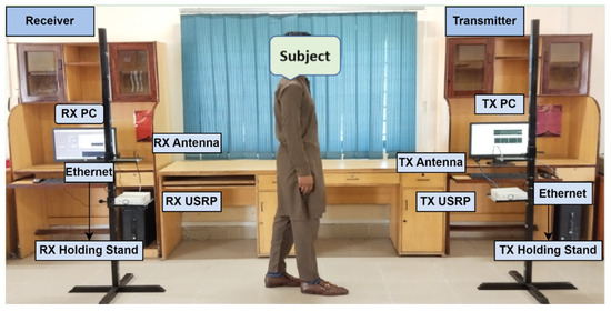 Data were collected through SDR technology using the RF sensing experimental setup, as depicted in Figure 3. In this platform, the transmitter side comprises a transmitter (Tx) PC that generates the required digital signals, a Tx USRP that translates these digital signals into RF, and a Tx antenna that transmits the RF signal. On the receiver side, an Rx antenna receives the RF signal, an Rx USRP transforms the RF signal back to digital form, and an Rx PC extracts the WCSI and analyzes the received WCSI data. Data communication and control between the Tx and Rx units were facilitated via Ethernet. An object was placed between the Tx and Rx sides to investigate the impact of human interference on the signals. The adjusted data collection information and parameters are given in Table 1 for the identification of FG activities. This experimental framework addresses real-time environmental challenges. The significant variations in the WSCI are helpful for analysis. Each individual performed the FG activities, and the variations in the RF signal were analyzed to detect different FG patterns.