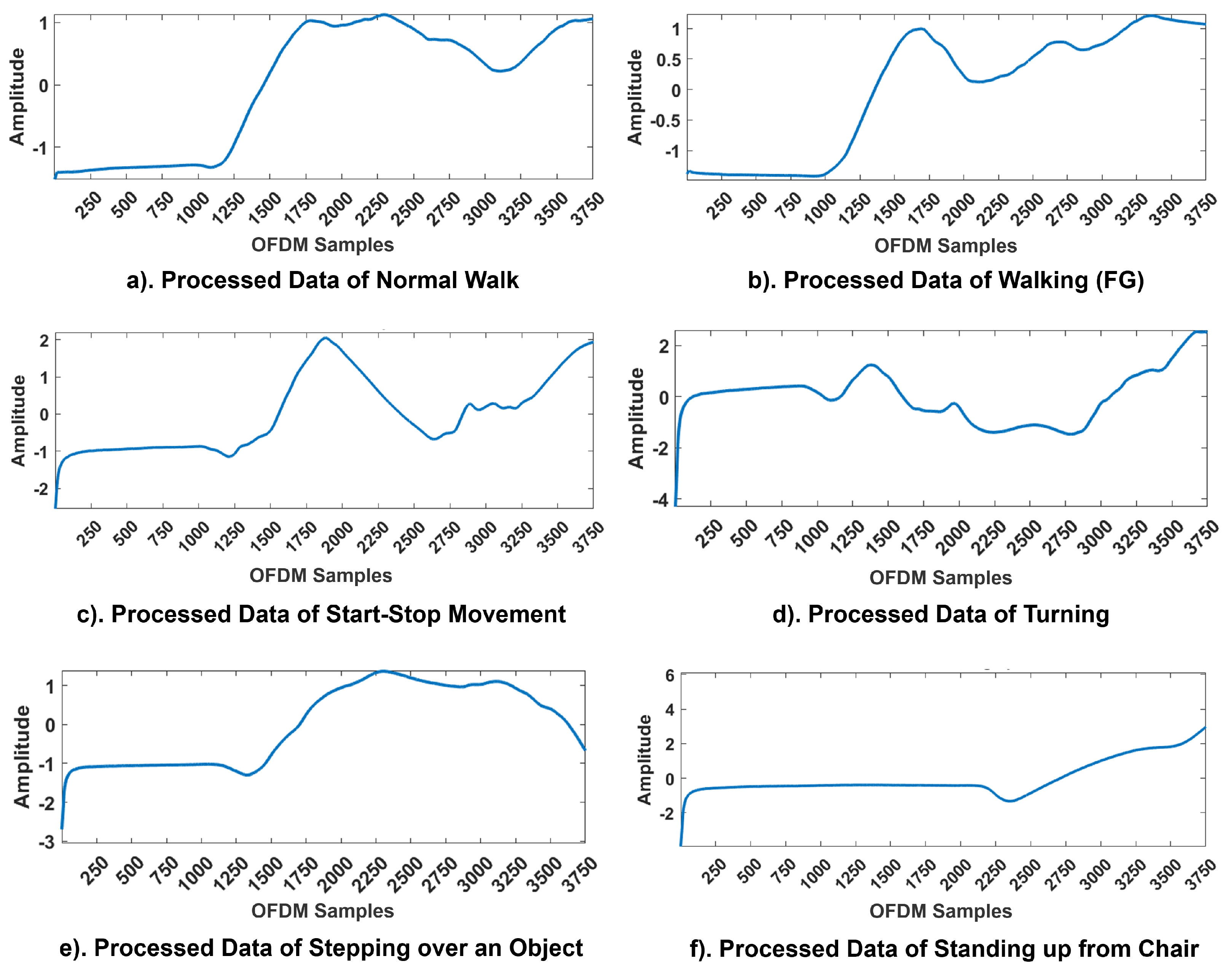 All patterns were affected by channel noise in real-time environments. However, the pre-processing techniques applied at the receiver end effectively retained critical information about sudden gait anomalies. The variations in the WCSI for each activity can be seen clearly in Figure 4. For each activity, a unique pattern was obtained for the WCSI, which was used for further processing and classification. The findings of the experiments showed that the proposed framework successfully navigated real-world challenges and identified significant trends in the WCSI corresponding to the FG patterns. The WCSI amplitude fluctuations associated with each activity provided a non-contact and non-invasive basis for detecting gait disturbances to prevent falls and improve QoL. The real-time analysis confirmed that the RF sensing system is capable of detecting gait disturbances, thereby validating its practical applicability in addressing these challenges.
