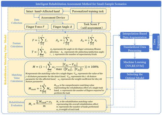 This study proposes an intelligent rehabilitation assessment method for small-sample scenarios, which calculates rehabilitation matching values based on feature values. After data expansion and normalization, the method is combined with machine learning to select the optimal model for assessment. The detailed process framework is shown in Figure 1.