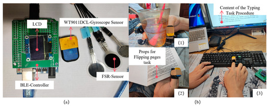 (1) Drinking water task, (2) Flipping pages task, (3) Typing task. Experimental setup (a) and real experiment scene (b).