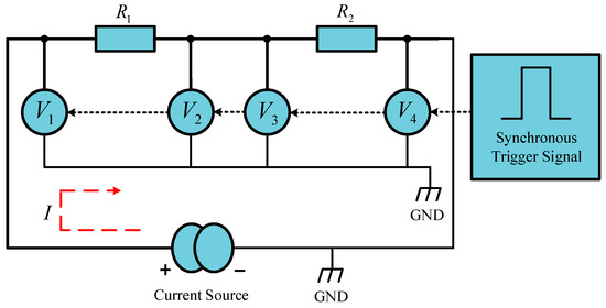 In this article, the test system employs two Fluke 8508A digital multimeters to measure the voltages across the test resistor and the standard resistor. The input terminals on the front and rear panels of each multimeter are connected to the respective ends of the resistors. By selecting the “F-R” mode on the 8508A’s control panel, the voltage difference between the front and rear panel inputs is calculated, providing the voltage data for the resistors. To ensure measurement accuracy and methodological rigor, each resistor in the system features single-point grounding at its low-potential terminal. This grounding scheme effectively eliminates potential measurement errors that could arise from ground loops or stray potentials when determining voltage differences between resistors. By maintaining strict electrical isolation at the measurement nodes, this design preserves the integrity of the synchronous sampling method and guarantees the reliability of acquired data. The implemented grounding strategy represents a critical component of our precision measurement architecture, as it prevents the introduction of systematic errors during high-impedance current measurements.