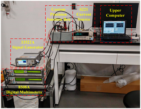 The measurement system designed in this article consists of two main functional modules: the external hardware measurement system and the upper computer control system developed using LabVIEW. As illustrated in Figure 2, the external measurement system integrates high-precision instruments and custom components to ensure accurate and synchronized resistance measurements. The key components include: