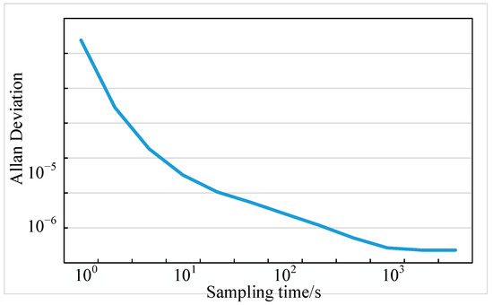 The Allan variance analysis curve of this resistance measurement system is shown in Figure 3, illustrating the variation trend of the voltage ratio data. In this measurement system, when the sampling time is 1000 s, the Allan standard deviation reaches its minimum of 10−6, indicating that the system has reached its measurement limit.