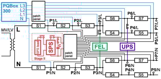 It is also worth noting that the indicated PQA meter used is a 3-phase instrument, while the measurements themselves for research purposes in Stages I and II were carried out in a single-phase circuit in such a way that the phase voltage channels of the meter were used for simultaneous voltage measurements at different points of the single-phase circuit. Simultaneous measurements were made possible by the use of a patch panel, which allowed for cross-connecting. Research in Stage I allows for the assessment of supraharmonic propagation. Research in Stage II allows us to explain, to a certain limited extent, the diagnostic problems observed in research in Stage III.