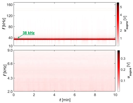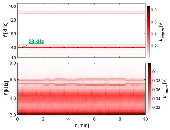 Spectrograms of supraharmonics of phase voltages in the bandwidths 2–9 and 10–170 at measurement point P6—supraharmonics generated by FEL and UPS.