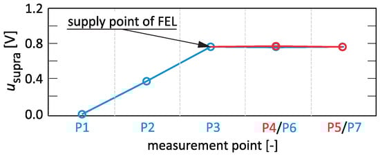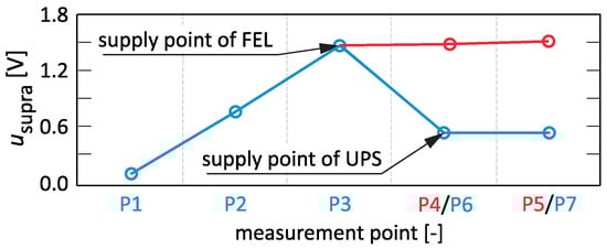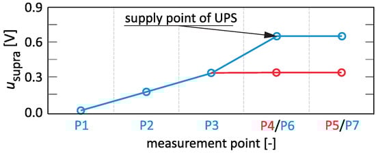 The bandwidth of the dominant FEL supraharmonics coincides with the bandwidth of the dominant UPS supraharmonics. Figure 9 shows the propagation of the average value of one of the dominant FEL supraharmonics for individual points of the network. In the case of supraharmonics generated by FEL, their propagation in the branch P1–P5 is analogous to the previous case. The propagation of supraharmonics in the branch P1–P7 changes due to the influence of the UPS supplied from the network point P6. The supraharmonics associated with the UPS influence the supraharmonics associated with the FEL, causing them to be attenuated. In turn, for the network points in this branch further away from P6, the supraharmonic values are maintained at the same level. The indicated cases show that the supply point of supraharmonic sources can be identified with the network point where the values are unilaterally fixed or their change is negligible compared to the increase with the preceding network point.