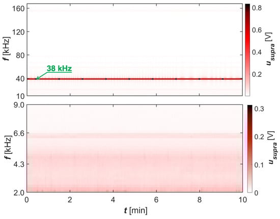 Spectrograms of supraharmonics of phase voltages in the bandwidths 2–9 and 10–170 at measurement point P6—supraharmonics generated by UPS.